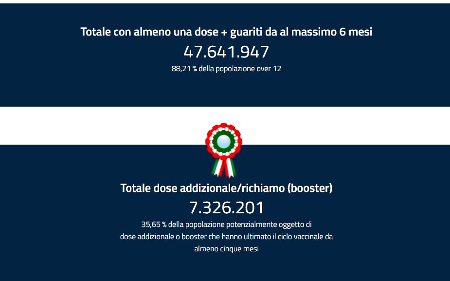 Secondo l’odierno bollettino del ministero della Salute, sono 16.806 i nuovi casi positivi al Covid-19 (ieri 15.085) e 72 i decessi (ieri 103) registrati nelle ultime 24 ore in Italia. Dall’inizio della pandemia sono 5.060.430 le persone che hanno contratto il virus Sars-CoV-2, mentre da febbraio 2020 il numero complessivo delle vittime è pari a 134.003. Sono in tutto 4.717.556 le persone guarite o dimesse, mentre sono 208.871 quelle attualmente positive, pari a +9.088 rispetto a ieri (+5.513 il giorno prima). Compresi quelli molecolari e gli antigenici, sono stati 679.462 i tamponi totali processati, ovvero 105.687 in più rispetto ai 573.775 di ieri. Il tasso di positività, ieri pari al 2,6%, scende al 2,5% (l’approssimazione di 2,47%). Sul fronte del sistema sanitario non si arresta la crescita delle degenze in ogni area. Sono +50 (ieri +21) i posti letto occupati nei reparti Covid ordinari, per un totale di 5.298 ricoverati. Sono +12 (ieri +3) i posti letto occupati in terapia intensiva: sono dunque 698 i malati più gravi, con 55 ingressi in rianimazione (ieri 62).