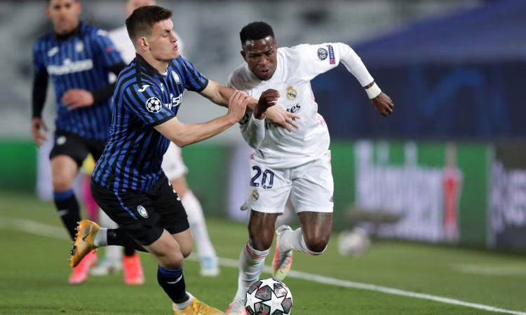 A Madrid, Zidane con il 3-5-2: Courtois; Varane, Sergio Ramos, Nacho; Vazquez, Valverde, Kroos, Modrić, Mendy; Benzema, Vinicius. Gasperini, che fa partire Iličič e Zapata dalla panchina, con il solito 3-4-2-1: Sportiello; Toloi, Romero, Djimsiti; Maehle, De Roon, Pessina, Gosens; Pašalić, Malinovskyi; Muriel. Arbitra l’olandese Makkelie. Atalanta spavalda. Al 3’ Gosens si inserisce, Courtois in due tempi. Al 16’ sugli sviluppi di un corner Djimsiti calcia alto. Prima chance per i padroni di casa al 27’ ma su Vinicius chiude Djimsiti (il Var certifica che non c’è fallo di mano). Passa il Real al 34’: dopo alleggerimento all’indietro di un difensore, Sportiello sbaglia il rinvio, Modrić imbuca per Benzema che non fallisce, segnando il suo 70° gol in Champions. L’Atalanta non si perde d’animo e continua a giocare all’attacco. Al 42’ Malinovskyi va al tiro, fuori di poco. Gasperini torna dagli spogliatoi con Zapata per Pašalić. Al 52’ Vinicius semina metà Atalanta, arriva a tu per tu con Sportiello e conclude fuori di un niente. Al 57’ è il momento di Iličič al posto di Gosens. Su un fallo di Toloi su Vinicius il Var opta per il rigore, dopo che Makkelie aveva decretato la punizione dal limite: dal dischetto Sergio Ramos trafigge Sportiello con un destro secco (60’).