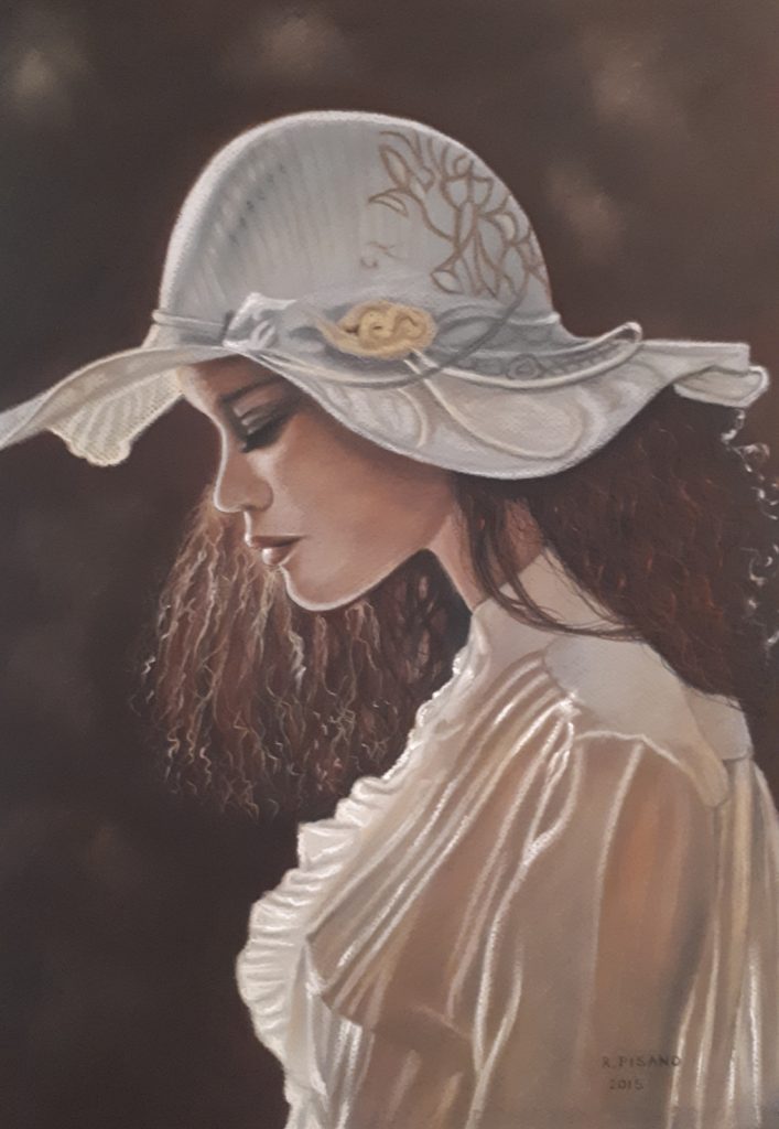 Maestro nel descrivere i dettagli, utilizza luci e ombre per dare quell’eccezionale senso di realtà alle protagoniste delle immagini che immortala, ma diventa superbo proprio grazie alla sua capacità di avvolgere tutto con l’atmosfera languida, rarefatta, delicata, che esalta il significato dei momenti rappresentati, li eleva e li sospende in un momento senza spazio e senza luogo, o meglio, li trasporta nell’universo emotivo. E lo fa a mano libera, sì perché la sua tecnica prediletta è quella del pastello che usa su carta, su cartoncino, su carta di velluto, come se la vicinanza della mano allo strumento, attraverso cui Pisano esprime la propria creatività, fosse fondamentale a farlo sentire più dentro l’opera che non con il pennello. Opere come I colori del desiderio, Emozioni, Passione, sono simbolici della sua capacità di cogliere l’attimo più palpitante, più profondo, quello in cui l’espressività dei soggetti è nel suo apice, pur essendone loro stessi inconsapevoli. E ancora Ragazza con cappello,