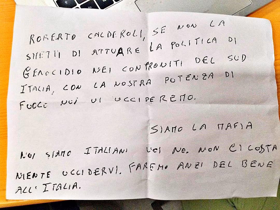 Il ministro ha tutto postato su Facebook, e questo dopo le sue dichiarazioni di ieri. Intervenuto alla festa della Lega di Bolgare (Bergamo), il rappresentante del Carroccio ha fatto vedere la lettera ai partecipanti, spiegando che non è certo la prima che riceve. “Questa volta mi sono preoccupato di più, vista la firma che hanno messo – ha dichiarato -. Non è la prima volta che mi arrivano lettere minatorie per il mio impegno sull’Autonomia, insieme a scritte sul cancello di casa e bossoli e proiettili. Ho sporto denuncia contro ignoti”. La lettera, a quanto pare, sarebbe stata inviata da Bari.