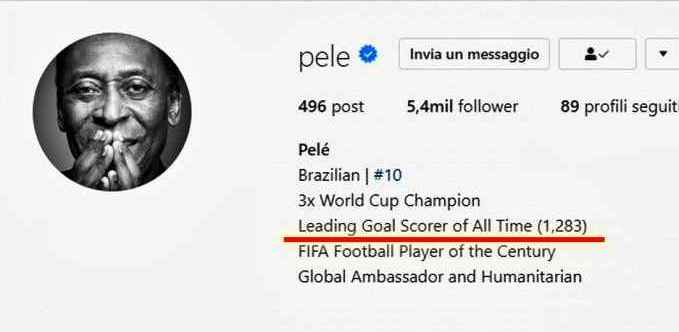 Con la doppietta all’Udinese Cristiano Ronaldo ha raggiunto i 758 gol in carriera (davanti, ad una sola distanza, ora c’è solo Bican) superando Pelé che, per le statistiche ufficiali, ne aveva segnati 757. Il brasiliano su Instagram però ha aggiunto una dicitura significativa nella sua biografia: “Miglior marcatore di tutti i tempi”, corredata del numero 1283 che conteggia anche le reti segnate con la nazionale paulista, con quella militare e nelle amichevoli.