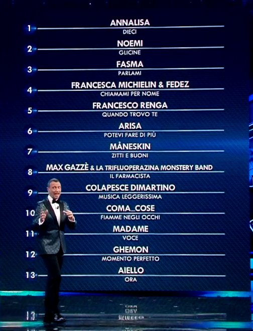 Nel mirino di Fiorello non poteva mancare il neo premier. “Draghi è Merkel con la cravatta. Lo salutiamo e gli auguriamo un buon lavoro – prosegue lo showman – è un premier di alto profilo, un curriculum con tantissime lauree. E poi parla cinque lingue…ma tutte insieme”. Spazio poi alla musica. Prima è il momento di quattro Nuove Proposte, con l’approdo alla finale per Gaudiano e Folcast. Venerdì si esibiranno per la finale. Ma l’avvio ufficiale della gara tra i big viene sancito con l’esibizione di Diodato, vincitore della scorsa edizione. Nel Teatro Ariston vuoto risuona il brano “Fai rumore”. L’emozione “tradisce” Diodato che stona in un acuto. Sul palco si alternano Arisa, Noemi, Ghemon, i Maneskin, Aiello, Colapesce Di Martino, Francesca Michielin e Fedez, Max Gazzè, Madame, Coma_Cose, Annalisa e Francesco Renga. Due momenti importanti della serata sono: l’appello per la liberazione di Patrick Zaki, e la lotta al femminicidio con Loredana Bertè che porta un paio di scarpe rosse sul palco dell’Ariston per dire “stop alla violenza sulle donne”. Infine, un ricordo, commosso, di Claudio Coccoluto, dj scomparso all’età di 59 anni. askanew