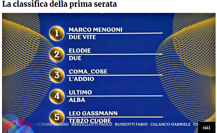 Marco Mengoni guida la classifica provvisoria a conclusione della prima serata del Festival di Sanremo. Ecco la classifica provvisoria: Marco Mengoni Elodie Coma_Cose Ultimo Leo Gassmann Mara Sattei Colla Zio Cugini di Campagna Mr. Rain Gianluca Grignani Ariete gIANMARIA Olly Anna Oxa.