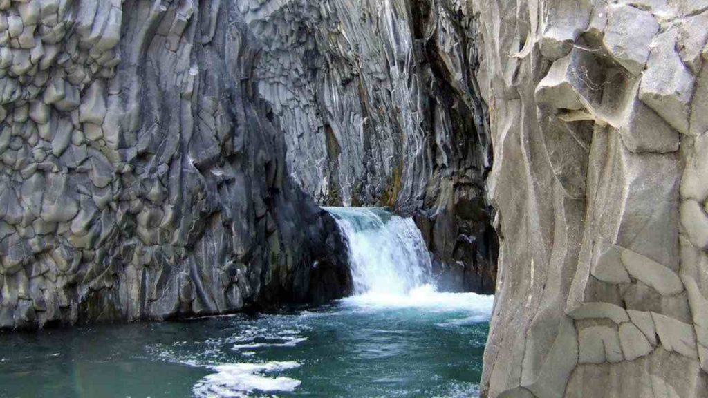 Questo luogo prende il nome di Gole dell’Alcantara e le pareti si presentano come imponenti prismi di roccia basaltica, con forme geometriche che sembrano scolpite dall’uomo ma sono in realtà il frutto di fenomeni naturali. La configurazione “a canna d’organo”, “a catasta di legna” e “a rosetta” è il risultato di un raffreddamento rapido e disomogeneo della lava a contatto con l’acqua del fiume. Contrariamente a quanto si crede, queste formazioni non sono state scavate dall’acqua, ma sono nate direttamente dalla solidificazione della lava.