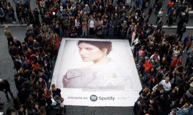 In occasione dell’uscita di “Fatti Sentire”, il nuovo disco di Laura Pausini, Spotify ha coinvolto i suoi fan in un grande flash mob. Due gruppi di fan si sono riuniti a Milano e a Roma rispettivamente all’Arco della Pace e in Piazza Navona apparentemente senza motivo, per poi improvvisamente muoversi al ritmo di ‘Non è detto’, il primo singolo estratto dall’album. La sorpresa è stata svelata quando ciascun gruppo, in contemporanea, ha composto la copertina del nuovo album: un vero e proprio billboard umano che ha permesso di realizzare la cover musicale più grande del mondo. La cantante di Solarolo è poi apparsa a sorpresa in Piazza Navona per festeggiare insieme ai suoi fan e a Spotify l’evento.