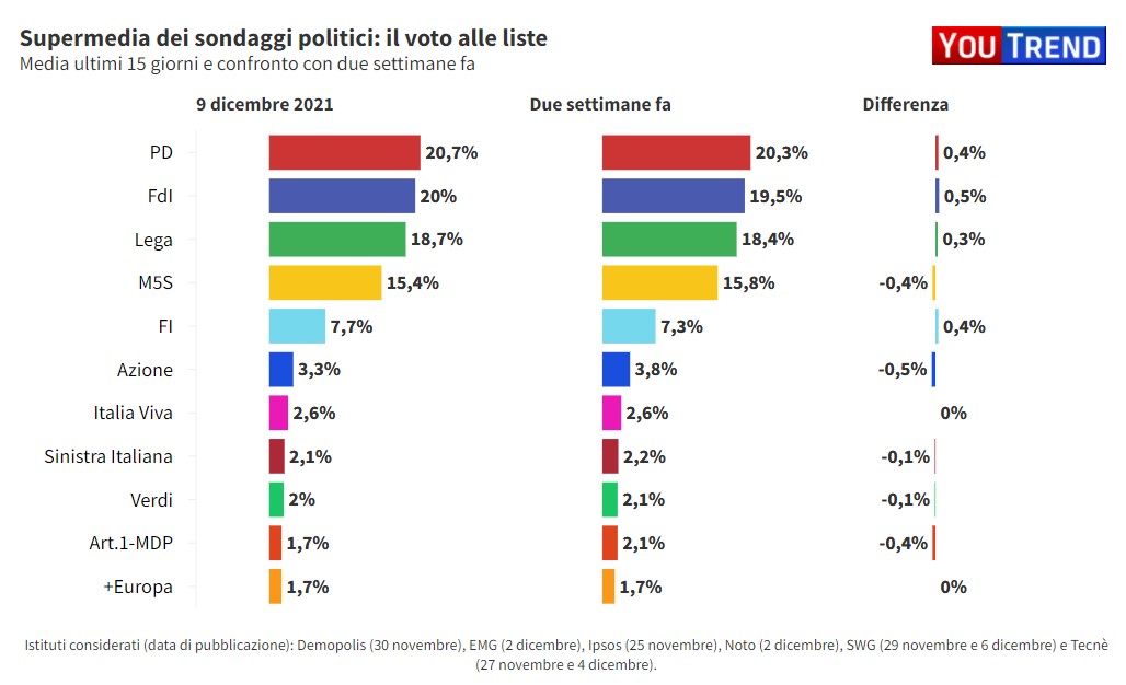 Non si contano più, ormai, i sondaggi che certificano un vasto e trasversale orientamento favorevole degli italiani nei confronti di questi strumenti, la qual cosa – insieme alla preoccupazione per la variante Omicron, di cui sono stati accertati diversi casi anche in Italia – sembra aver indotto anche le forze politiche meno entusiaste (cioè Lega e FDI) a mettere da parte le polemiche. Tutto questo sembra aver avuto un qualche effetto sulle intenzioni di voto: infatti, secondo la Supermedia dei sondaggi di questa settimana, è il centrodestra ad aver fatto registrare il maggior aumento di consensi negli ultimi 15 giorni. In questo lasso di tempo, infatti, hanno guadagnato terreno sia i 3 partiti principali – FDI, Lega e Forza Italia – sia i “cespugli” centristi della coalizione. Anche il Partito Democratico però ha guadagnato qualcosa (+0,4%), il che consente ai democratici di mantenersi al primo posto tra i partiti.