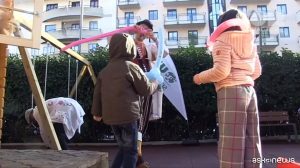 Bambini esultanti che ballano sulle notte dei brani dello Zecchino d'oro con i palloncini in mano e le coroncine in...