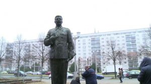 Una statua raffigurante Joseph Stalin è stata posizionata con una grossa gru sulla Karl-Marx-Allee a Berlino, nell'ambito di una mostra...