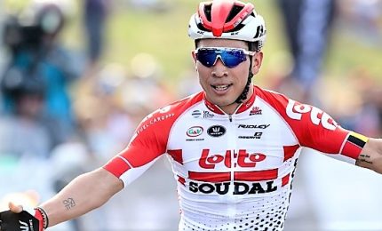 Caleb Ewan, Lotto Soudal, vince in volata l'ottava tappa del Giro d'Italia, la Tortoreto Lido-Pesaro di 235 chilometri, davanti all'italiano...