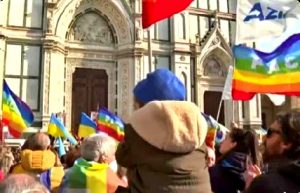 Al via in piazza Santa Croce a Firenze, popolata da bandiere della pace e dell'Ucraina (ma ci sono anche quelle...