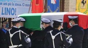 Il feretro avvolto dal tricolore, portato in spalla da sei agenti della Polizia. La moglie accovacciata sulla bara, quasi a...