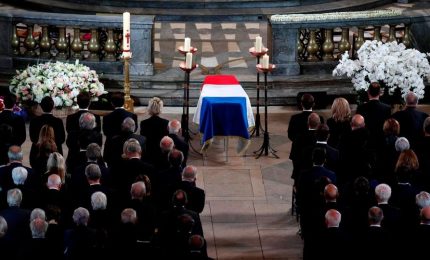 Al termine della messa solenne nella Chiesa di Saint Sulpice a Parigi, la bara del presidente Jacques Chirac, morto quattro...