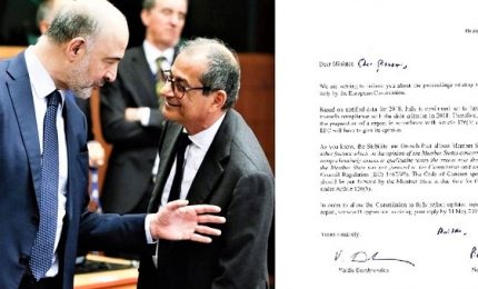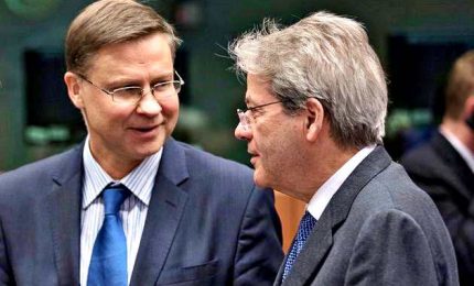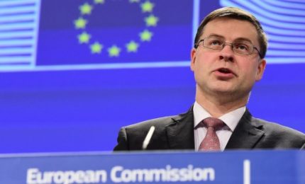 Il commissario europeo agli Affari economici e finanziari, Pierre Moscovici, e il vicepresidente della Commissione responsabile per l'Euro, Valdis Dombrovskis,...