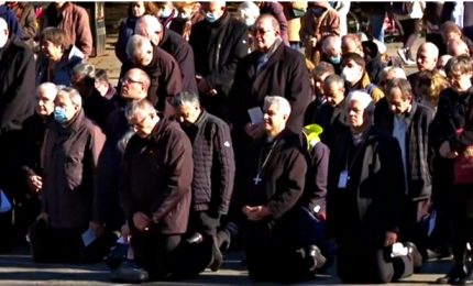Centoventi vescovi francesi, riuniti a Lourdes per la conferenza episcopale annuale, hanno partecipato a un atto di penitenza inginocchiandosi in...
