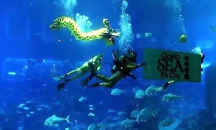Tenero spettacolo all'acquario di Singapore, le mante hanno familiarizzato con i sub, li riconoscono appena entrano nella vasca, capiscono che...