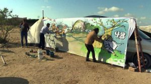 Decorare le tende del campo profughi con la storia della Palestina. Alcuni artisti arabi hanno dipinto una scena che rappresenta...
