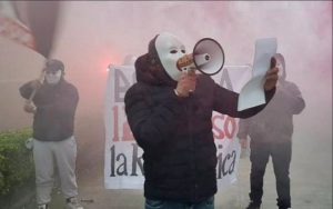 Blitz di alcuni manifestanti con volto travisato e bandiere di Forza Nuova sotto la sede romana del quotidiano 'La Repubblica'....