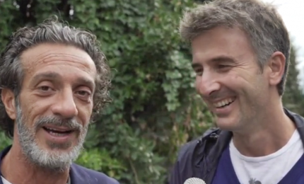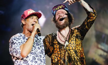 Cappellino rosso con la scritta Jova per Fiorello, stesso modello ma blu per Jovanotti. I due insieme sul palco di...