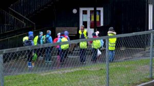 I bambini dopo sei settimane a casa varcano la soglia della loro scuola in questa elementare di Oslo, Norvegia, dove...