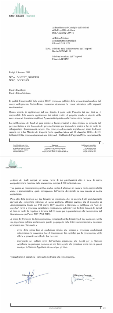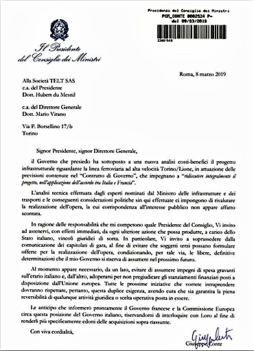 La lettera Telt inviata al presidente del consiglio Giuseppe Conte.