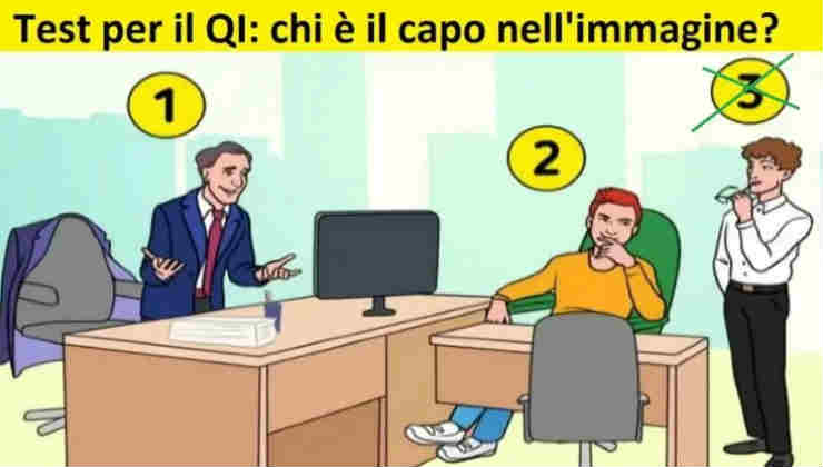 Nel test proposto da “Everyeye.it”, si vedono tre impiegati in una stanza d’ufficio. Il primo è seduto, in modo composto e formale, in completo blu. Sembra lui il boss, al primo acchito probabilmente. Poi c’è il secondo, vestito super casual con una felpa chiara seduto spaparanzato. E infine il terzo, in piedi, anche lui elegante che segue il discorso in piedi.