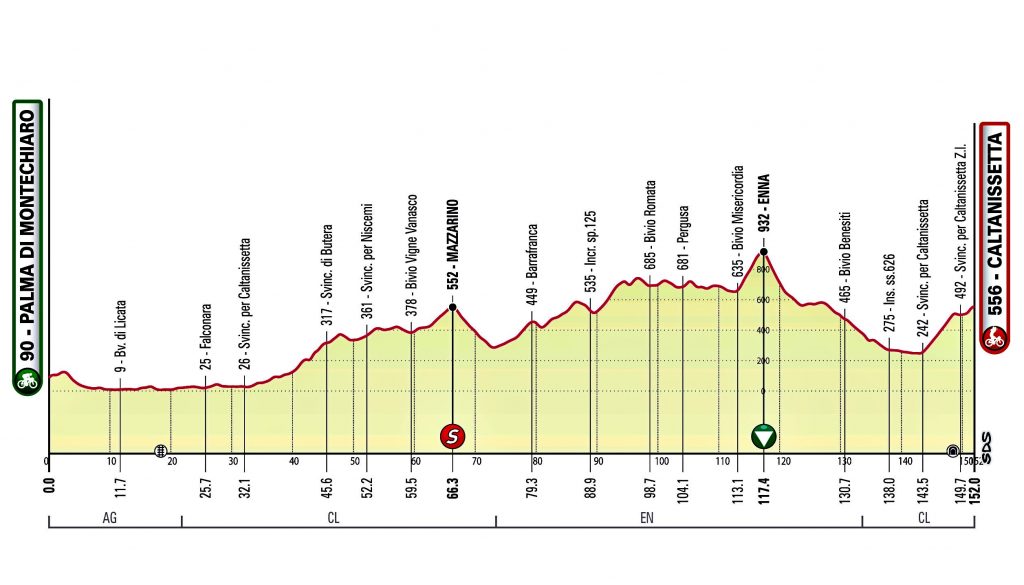 Tappa impegnativa, caratterizzata da un continuo saliscendi su strade ampie attraverso l’entroterra. Si contano solo tre veri attraversamenti cittadini: Mazzarino, Barrafranca ed Enna con le tipiche caratteristiche di dimensioni a volte ridotte. A Enna, in vetta alla salita di ingresso cittadino è posto il GPM di giornata. Finale su strade larghe e ben asfaltate e arrivo in centro a Caltanissetta al termine di una breve risalita.