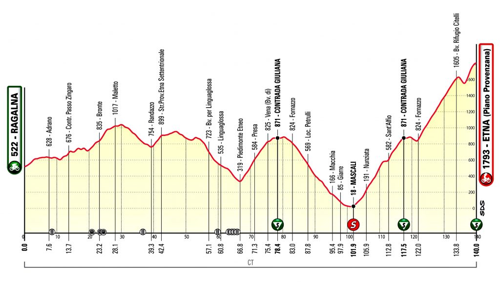 Tappa di alta montagna con poco respiro dopo metà corsa. Prima parte lungo la strada che contorna l’Etna collegando Biancavilla, Adrano, Bronte, Maletto e Randazzo. Qui la corsa sale lungo il vulcano per contornarlo più in quota sulla Sp. Quota Mille. Discesa attraverso Linguaglossa (passaggio impegnativo) fino a Piedimonte Etneo dove comincia la prima salita “Superior” della tappa che porta a Contrada Giuliana. Discesa impegnativa attraverso Milo e Santa Venerina fino a Giarre. Dopo Mascali (TV di tappa) inizia la seconda ascesa a Contrada Giuliana diversa e leggermente più impegnativa della precedente. Dopo il GPM breve falsopiano a scendere prima della salita finale di 18 km a partire da Fornazzo.