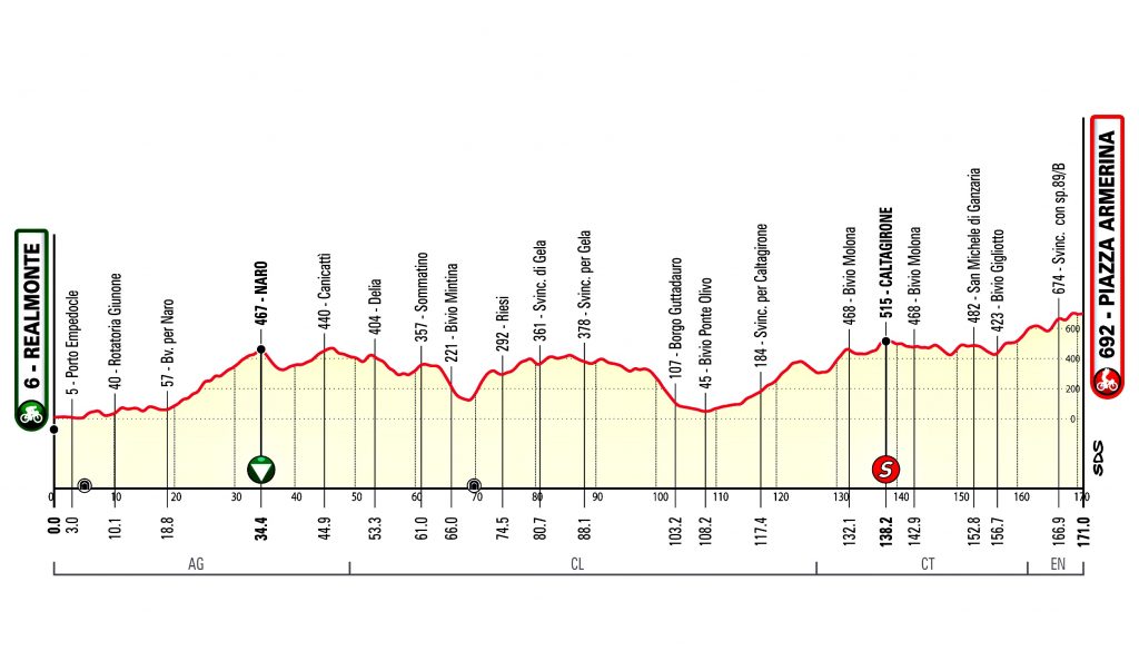 Tappa molto mossa altimetricamente, senza salite particolarmente impegnative, ma segnata da susseguirsi di salite e discese più o meno lunghe con due soli attraversamenti cittadini. Primo attraversamento a Canicattì con carreggiate ristrette in alcuni tratti e secondo, più agevole, a Caltagirone in cima a una breve salita dove verrà assegnato il Traguardo Volante di giornata. Finale tutto leggermente a salire fino a Piazza Armerina.