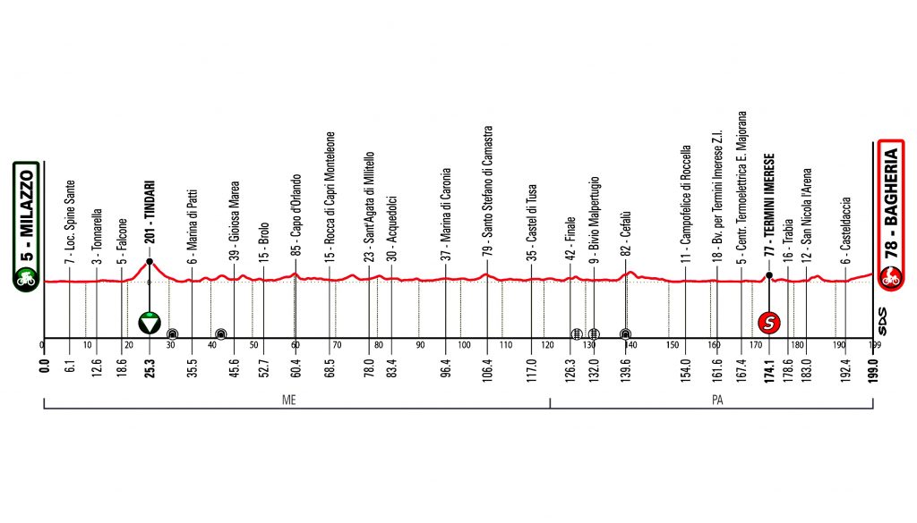 Tappa ondulata, costellata di curve e saliscendi. Si svolge interamente, a parte qualche chilometro all’inizio, sulla statale 113 che percorre la costa nord della Sicilia. Unica asperità la breve salita pedalabile a Tindari dopo soli trenta chilometri e lo strappetto di Termini Imerese in cima al quale verrà aggiudicato il traguardo volante di tappa. Finale molto veloce per la volata a gruppo compatto.