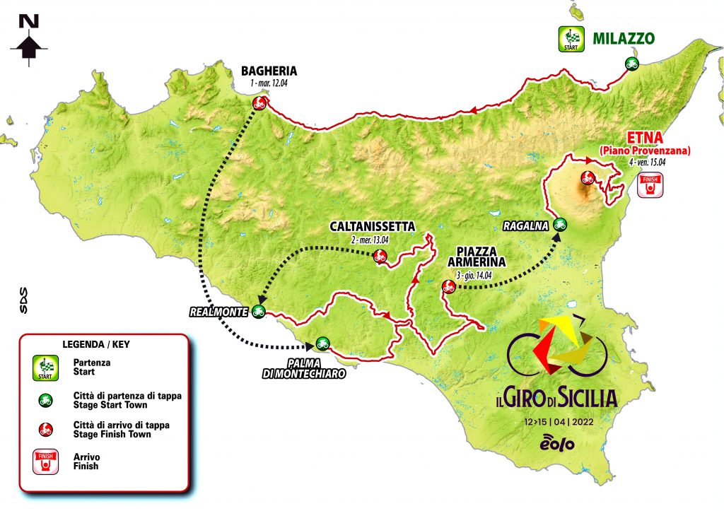 Sono state presentate presso la sede della Regione Siciliana di Catania, alla presenza dei rappresentanti dei comuni di Milazzo, Palma di Montechiaro, Realmonte, Caltanissetta, Piazza Armerina, Ragalna, Linguaglossa, le quattro tappe de Il Giro di Sicilia Eolo 2022. Un percorso variegato adatto alle caratteristiche di ogni tipo di corridore: velocista, finisseur e scalatore. La corsa anticiperà di neanche un mese la carovana rosa del Giro d’Italia che giungerà dall’Ungheria – per il giorno di riposo e le prime due tappe italiane – sull’isola.
