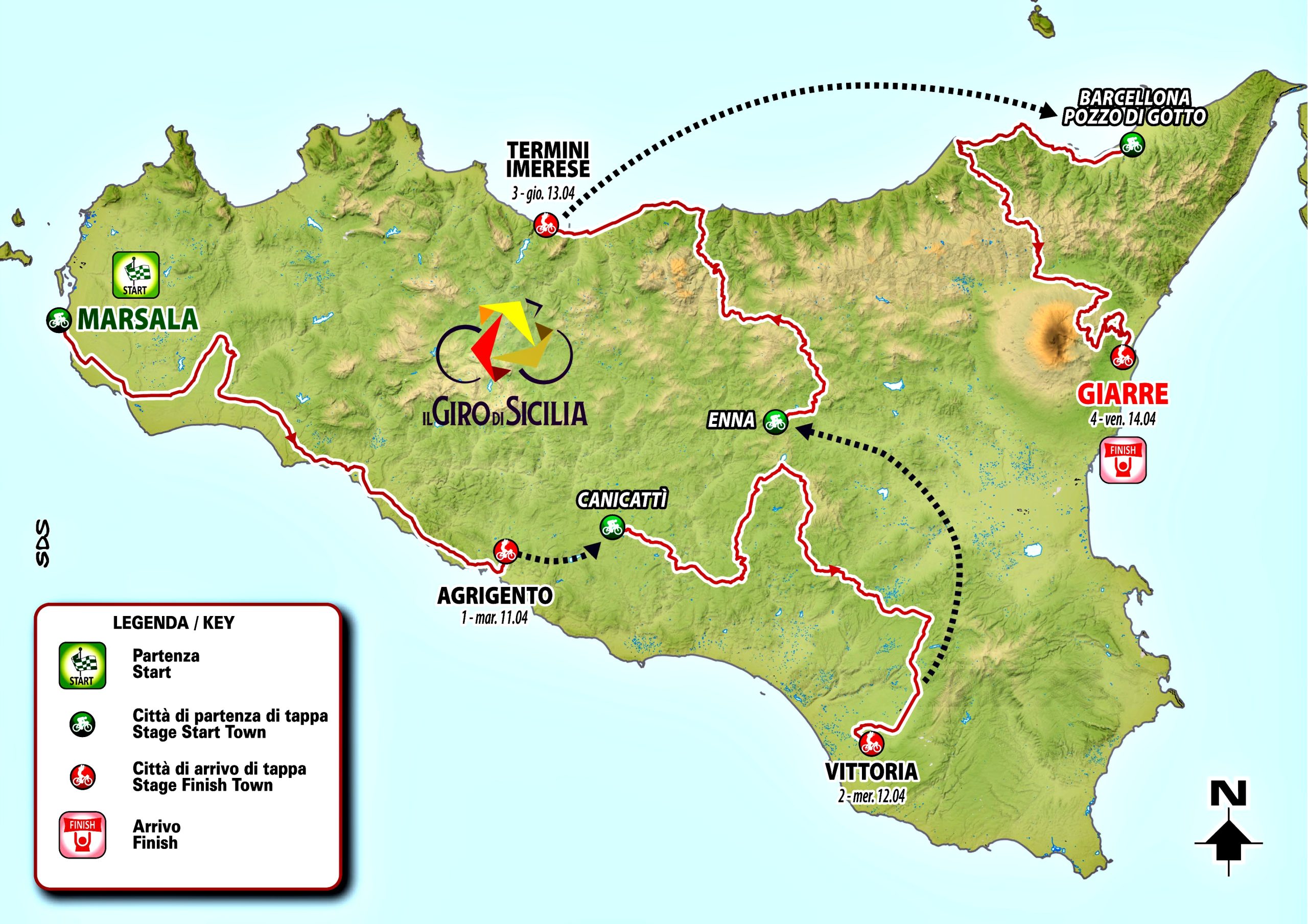 Quattro tappe, per complessivi 718 chilometri, che percorreranno la Sicilia da ovest a est, con partenze e arrivi nelle province di Trapani, Agrigento, Ragusa, Enna, Palermo, Messina e Catania. Presentato a Palermo il Giro ciclistico di Sicilia, che si terrà dall’11 al 14 aprile, organizzato da Rcs Sport in collaborazione con la Regione Siciliana. La prima tappa, di 159 chilometri, porterà i corridori da Marsala ad Agrigento, mentre la seconda (193 chilometri) da Canicattì a Vittoria. Terza frazione di 150 chilometri, da Enna a Termini Imerese. L’ultima tappa, la più impegnativa, prenderà il via da Barcellona Pozzo di Gotto e si concluderà a Giarre al termine di un percorso di 216 chilometri.