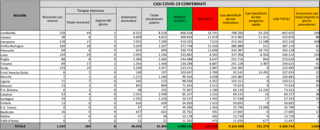 Sono 1.010 i nuovi contagi da Coronavirus registrati in Italia nelle ultime 24 ore e 14 i nuovi decessi. A rilevarlo l’odierno bollettino del ministero della Salute. Ieri i numeri del bollettino raccontavano di 907 contagi e 24 morti. Nelle ultime 24 ore sono stati effettuati 177.977 tamponi. Il tasso di positività è invece salito allo 0,56%. In terapia intensiva ci sono 7 persone in meno, 180 in totale. Nei reparti ordinari invece sono ricoverati 1.234 pazienti, 37 in meno di ieri.