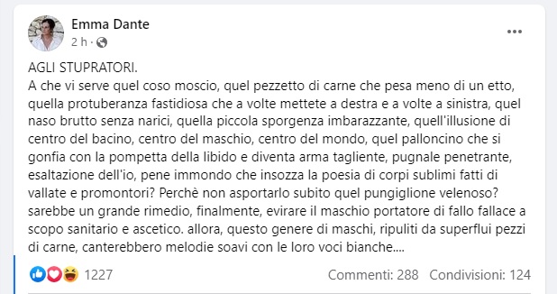 Il post è rivolto “agli stupratori”: “A che vi serve quel coso moscio, quel pezzetto di carne che pesa meno di un etto – scrive -, quella protuberanza fastidiosa che a volte mettete a destra e a volte a sinistra, quel naso brutto senza narici, quella piccola sporgenza imbarazzante, quell’illusione di centro del bacino, centro del maschio, centro del mondo, quel palloncino che si gonfia con la pompetta della libido e diventa arma tagliente, pugnale penetrante, esaltazione dell’io, pene immondo che insozza la poesia di corpi sublimi fatti di vallate e promontori? Perché non asportarlo subito quel pungiglione velenoso? Sarebbe un grande rimedio, finalmente, evirare il maschio portatore di fallo fallace a scopo sanitario e ascetico. Allora, questo genere di maschi, ripuliti da superflui pezzi di carne, canterebbero melodie soavi con le loro voci bianche….”. Il post sta provocando una serie di reazioni dividendo i follower della regista.