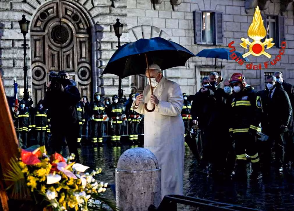 Visita a sorpresa questa mattina alle 7 di Papa Francesco che si è presentato in Piazza di Spagna per portare la sua preghiera in forma privata a Maria Immacolata. Il Santo Padre, ha fatto sapere il direttore della Sala Stampa Vaticana, Matteo Bruni, ha “deposto sotto la pioggia un mazzo di rose bianche alla base della colonna dove si trova la statua della Madonna e si è rivolto a Lei in preghiera, perché vegli con amore su Roma e sui suoi abitanti, affidando a Lei tutti coloro che in questa città e nel mondo sono afflitti dalla malattia e dallo scoraggiamento”.